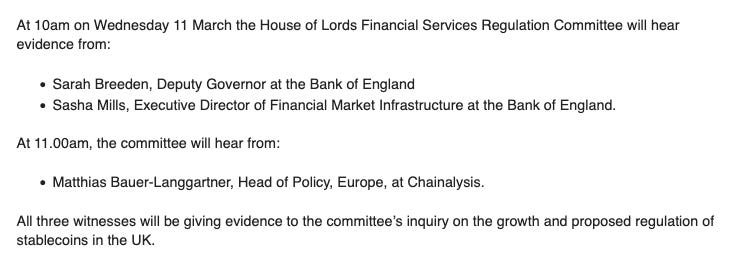Bank of England and Chainalysis to Give Evidence to Lords Stablecoin Inquiry on Wednesday